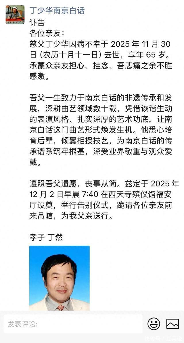 12月1日,南京白话演员、笑星丁少华之子丁然在父亲丁少华朋友圈发讣告:慈父 丁少华因病不幸于2025年11月30日去世,享年65岁。